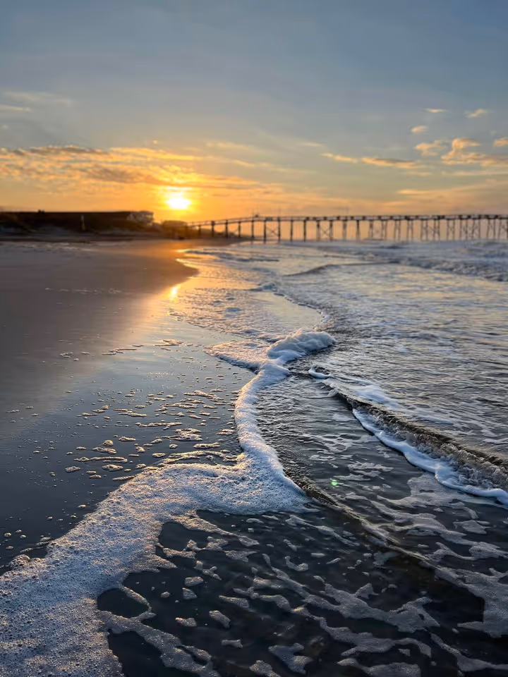 Situated on pilings, the home offers panoramic views of the ocean at both sunrise and sunset with just a short 1/4 mile walk to the Oak Island Pier. Covered front porch with rocking chairs and back deck with seating. You can choose the sunny or shady side of the house, both with ocean views while you hear the waves breaking. Extra-large enclosed outdoor shower with hot and cold water.