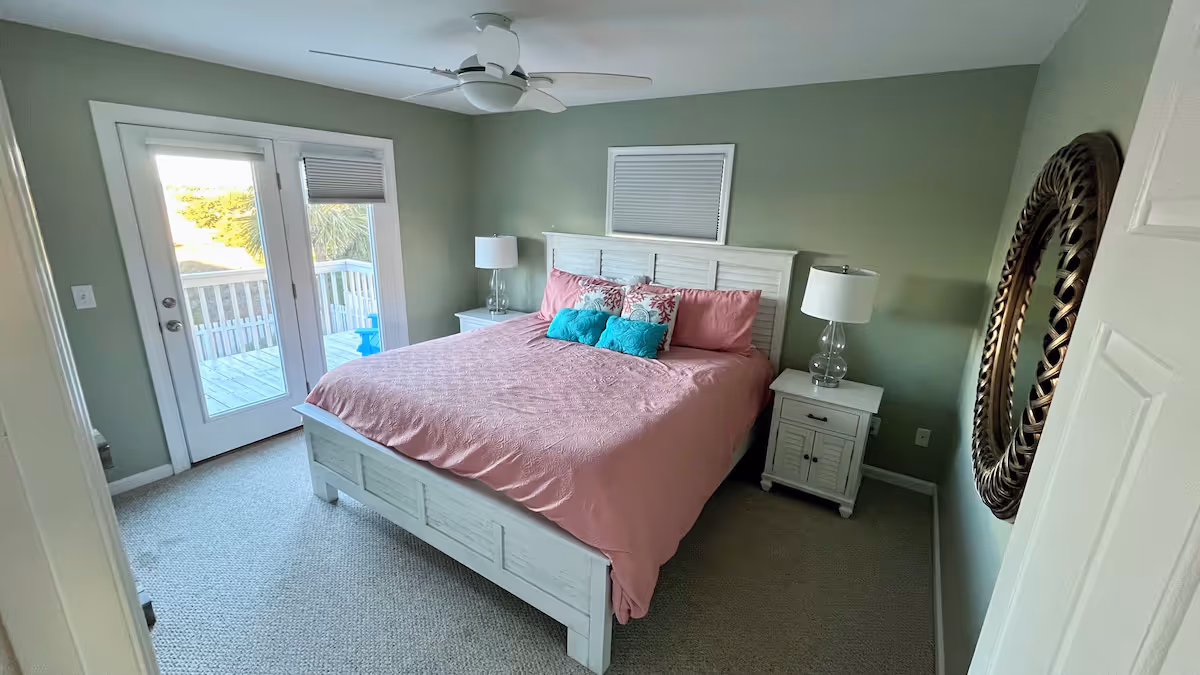 The second-floor features two additional bedrooms and a newly renovated bathroom. The primary bedroom includes a comfy king-sized bed featuring new bedroom furniture for 2024 as well as a Smart TV. The secondary bedroom features two brand new wooden twin-over-full bunk beds.